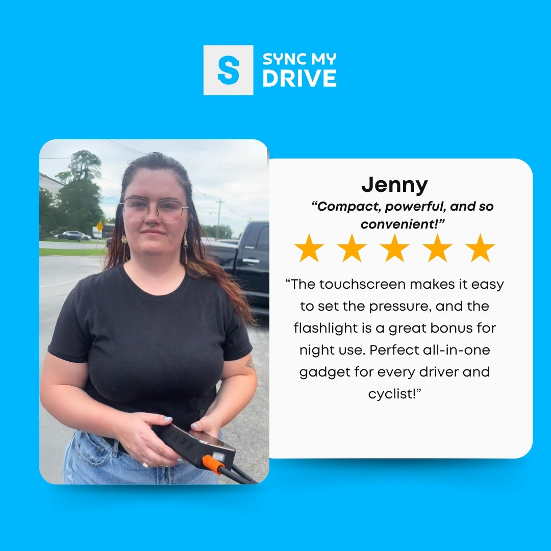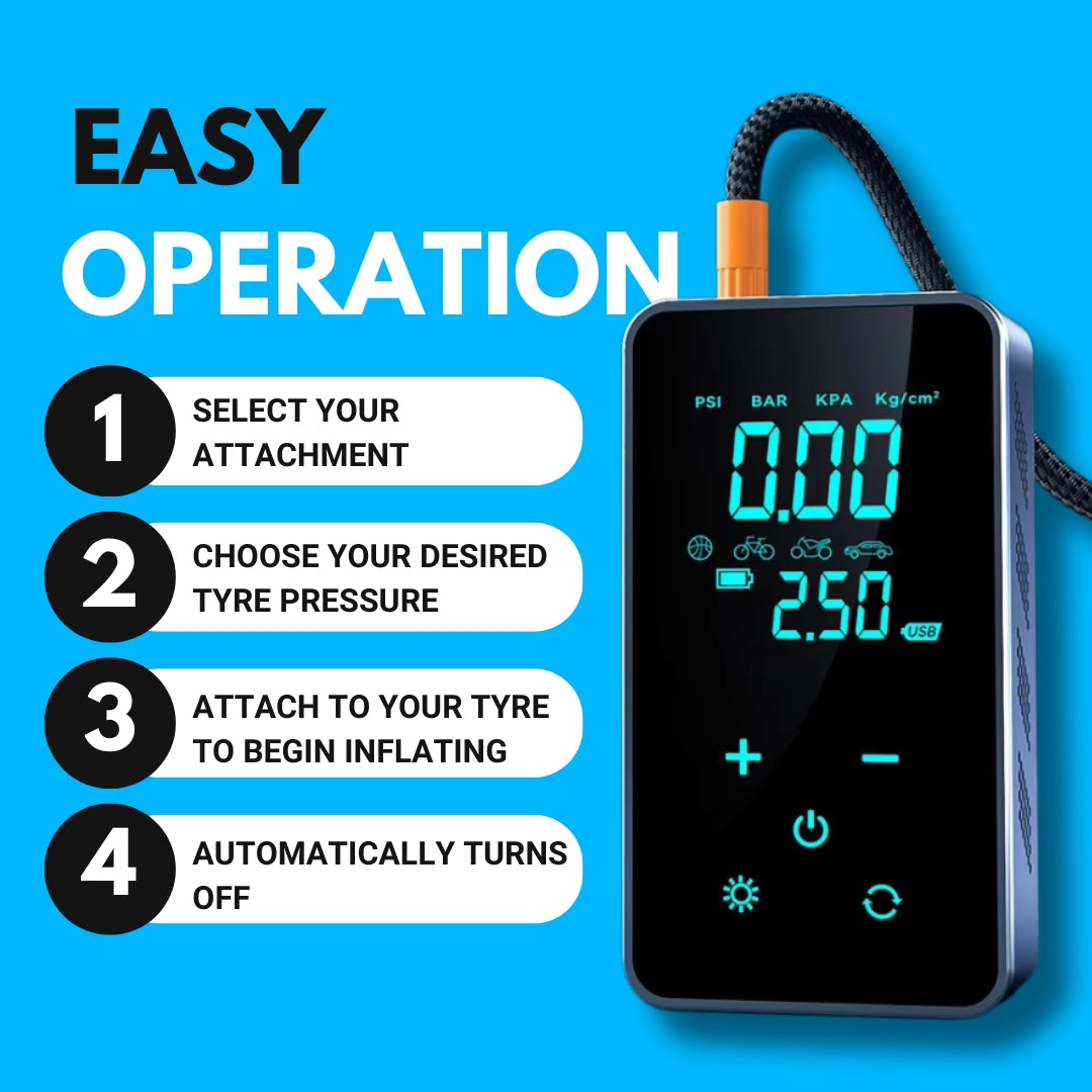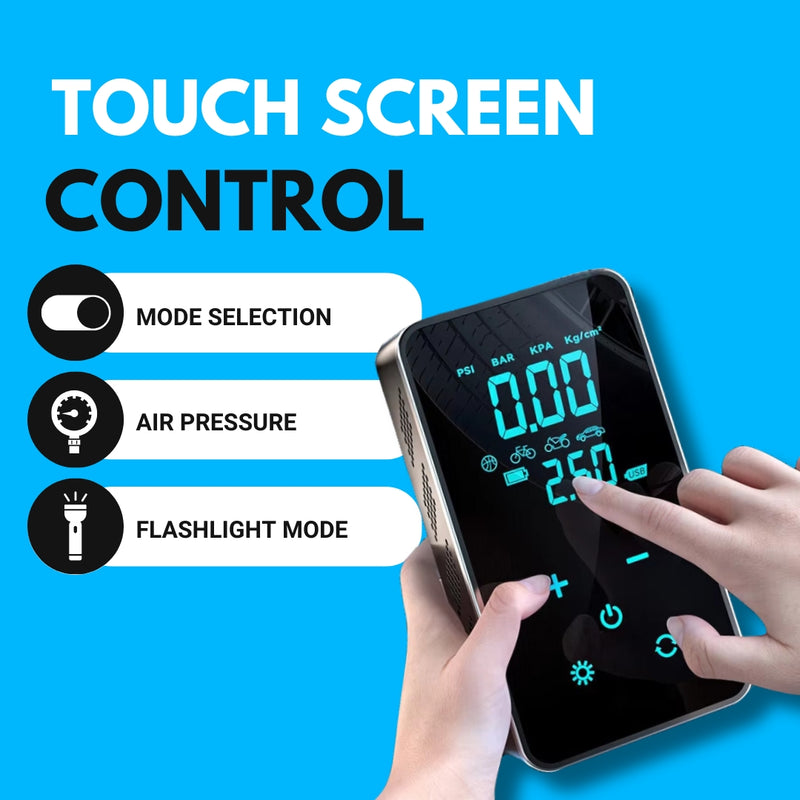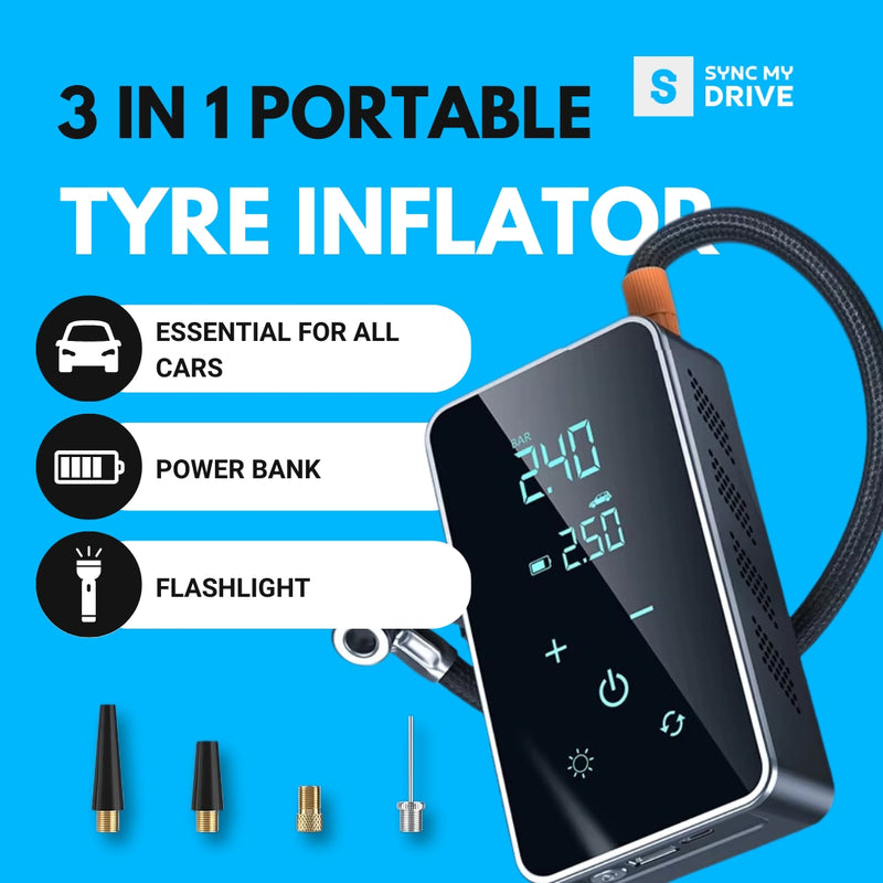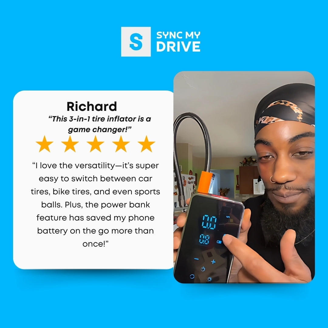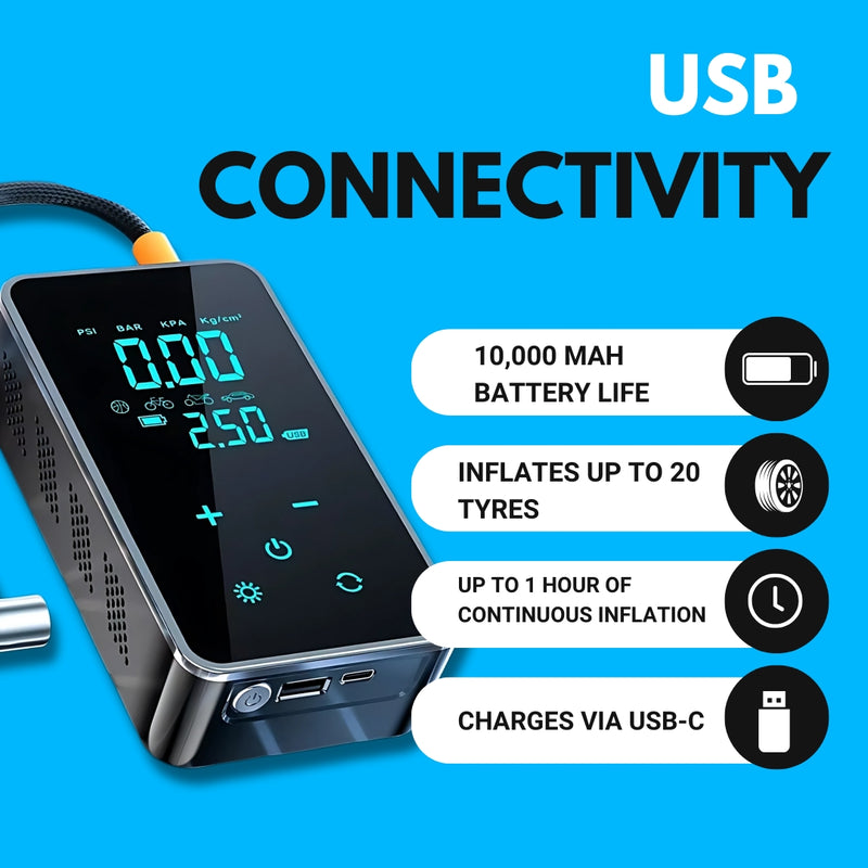 Our 3-in-1 Portable Tire Inflator easily handles car and bike tires, sports balls, and more. With USB connectivity, it doubles as a power bank to keep your devices charged on the go. Featuring a touchscreen interface, multiple attachments, and a built-in flashlight, it’s perfect for both emergencies and daily use.