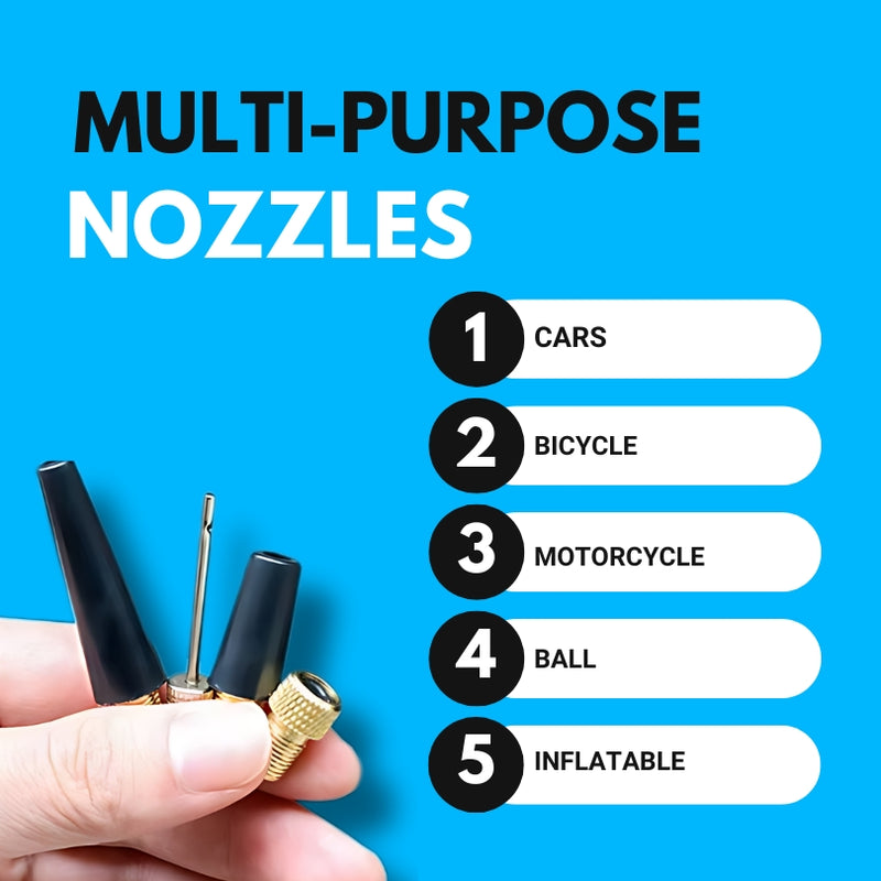 Inflate car tires, bike tires, balls, and other inflatable items effortlessly. Our inflator comes with multiple nozzles, ensuring compatibility for a wide range of uses.
